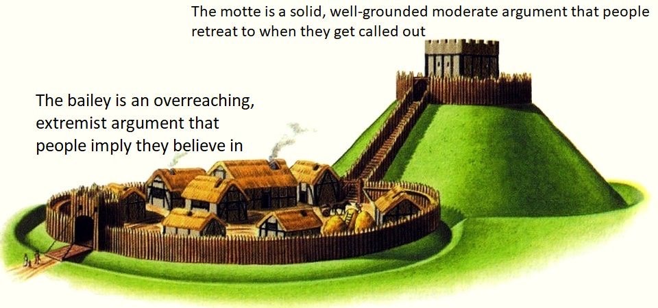 Going from the second to the third version of the headline/analogy ascends the ramp of retreat into the safety of the motte. These versions prepare the reader for the second level of understanding the essay, which is more reasonable, as some have pointed out.