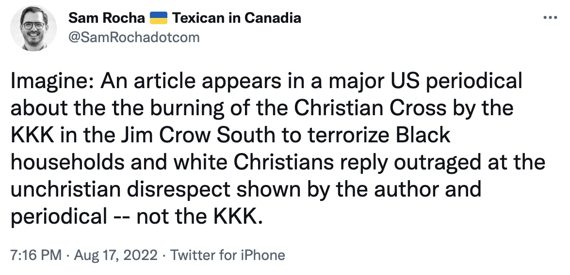 - #2: “How Extremist Gun Culture Co-Opted the Rosary” — becomes: “How the KKK Co-Opted the Cross”