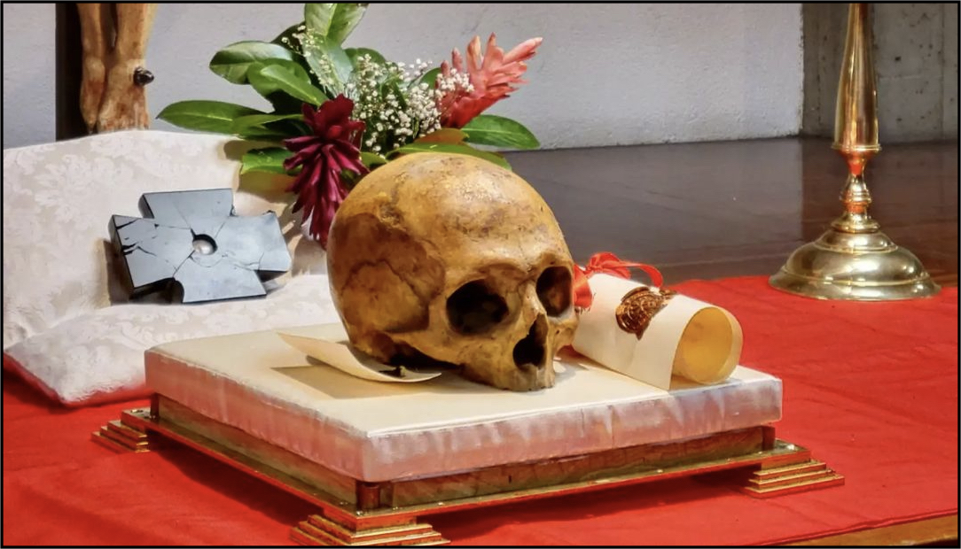The skull of St. Thomas Aquinas on display at the Dominican convent of Toulouse, France, in preparation to celebrate the 700th anniversary of the Angelic Doctor’s canonization.