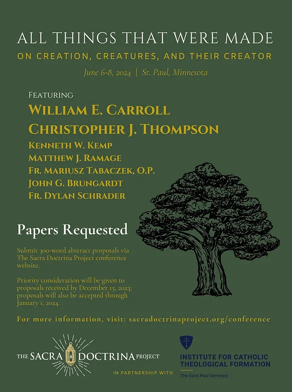 The Sacra Doctrina Project’s annual Conference has been announced for June 6–8 2024. It’s theme: “All Things That Were Made: On Creation, Creatures, and Their Creator.”
